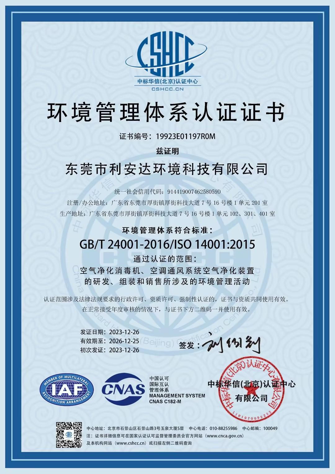 環境管理體系認證證書